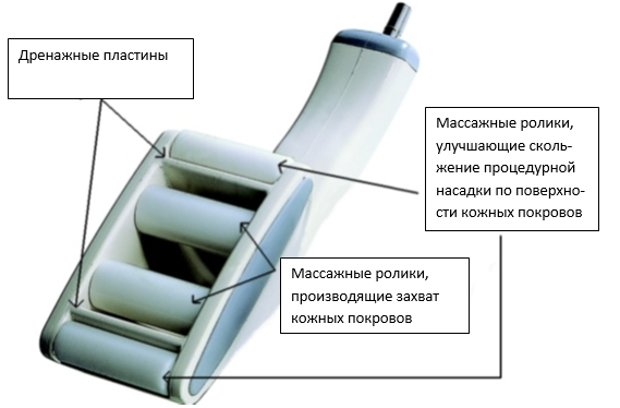 Два внутренних встроенных массажных ролика осуществляют циркуляционный массаж, воспроизводя тем самым пальпационную технику массажного воздействия, в то время как два внешних ролика позволяют процедурной насадке легко и свободно перемещаться по поверхности кожных покровов, подвергаемых процедурному воздействию.
